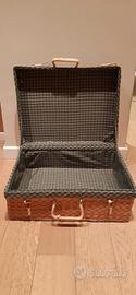 Cestino in rattan con interno foderato in tessuto color verde, disegno scozzese.