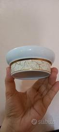 Cestino piccolo porta confetti e cioccolatini, porcellana con marchio Trussardi sotto il fondo, tutto e come da foto e descrizione, un piccolissima imperfezione difetto di fabbrica, mai utilizzato e rimasto sempre conservato con cura in mancanza di posti, diametro rotondo sopra circa 11x11/ cm./ altezza circa 4. 2/ cm./ nessuna scatola persa, del restante e sempre nuovo senza scatola, possibilità di ritiro a mano, spese di spedizione da concordare, l'imballaggio sarà adattato e curato. 🤩