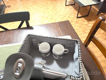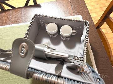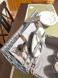 Cestino in vimini per picnic, comprensivo di 2 piatti in porcellana, 2 tazze, 2 coltelli, 2 forchette, 2 cucchiai. Usato solo una volta
