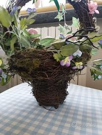 cestino con manico, finemente intrecciato con ricca decorazione di fiori. Stile chabby chic. Misura 28 x 22 cm e 38 cm di altezza.