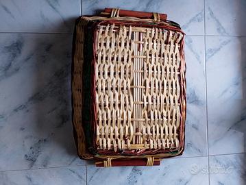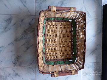 Cesto in vimini rettangolare con manici in legno.