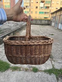Realizzato in vimini spesso e resistente, ha un manico centrale ben saldo e una lavorazione compatta e robusta. È in ottime condizioni generali, pronto all’uso.