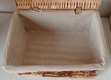 Vendo cestone da pic-nic MAI USATO. Dotato di serratura frontale e internamente rivestito di tela, sfoderabile, con maniglia in pelle. Le misure di ingombro esterne sono: 47 per 35 centimetri con 21 di altezza; le misure di capienza interna sono: 40 per 30 centimetri (alla base, il volume è trapezoidale) per 18 di altezza. Vendo a meno della metà del prezzo del nuovo. (Consigliata consegna a mano per via dell'ingombro).