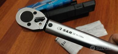 Chiave dinamometrica S&R 3/8", lunghezza 37,5 cm, coppia di serraggio 19-110 NM, completa di valigetta e accessori. Usata molto poco, ottime condizioni.