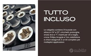 Valigetta attrezzi completa 108 Pezzi La valigetta comprende una vasta gamma di strumenti, tra cui 31 bussole con attacco da 1/4" e 1/2", cricchetti, prolunghe, snodi, leva a "T", inserti per viti con diverse forme (a taglio, a croce, brugole e Torx), adattatore e chiavi esagonali. Questo kit rappresenta una soluzione completa per affrontare molteplici applicazioni che richiedono la manipolazione di viti o bulloni di varie dimensioni e forme, offrendo la massima versatilità e praticità per chi lavora nel settore dell'officina o del fai-da-te. Materiali di qualità Kit di strumenti affidabili e duraturi, ideati da artigiani e professionisti del settore. Specifiche Set completo di prese, punte e adattatori Prese esagonali corte e lunghe Punte a croce, Torx e esagonali Cricchetto, giunto universale e barra di scorrimento inclusi Adattatori per diverse dimensioni di viti e bulloni Pezzi 108 Materiali Acciaio cromo vanadio Tipo di chiavi Chiavi a bussola, inserti avvitatori, punte adattatore, cricchetto reversibile, avvitatori a snodo Valigetta portatile