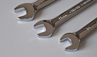 Chiavi inglesi nuove, con testa snodata a cricchetto che agevola notevolmente il lavoro. Le chiavi non sono mai state utilizzate, nessun segno di usura. Le misure sono la 10, 11 e la 13 mm.