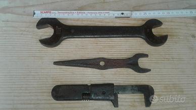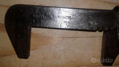Vendo chiave grande misure da 29 e 32 marca Bonner Quality Tools (inglese) lunghezza 30 cm spessore 1,7 cm, chiave al centro (sulla foto) in ferro battuto dell'800, lunghezza 21 cm, spessore 1 cm (chiave da 27), chiave inglese antica lunghezza 15,5 cm, aperta lunghezza 22 cm, apertura massima dove si aggancia 6 cm, spessore 1 cm, marca Wrench SS U.S.A. Wakefero Wraster MASS. - U.S.A. N.O. 8, Pattisept 4 1900. Spese di spedizione 11 euro.