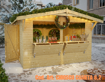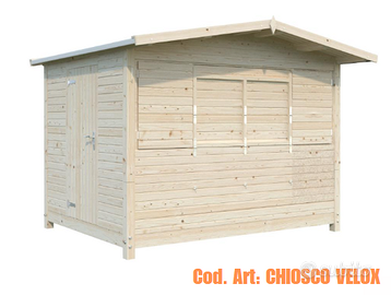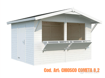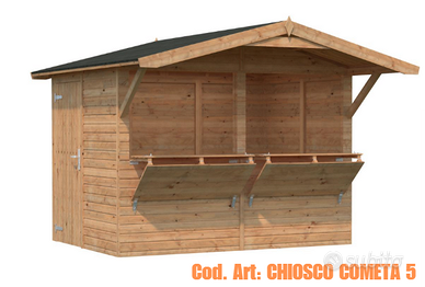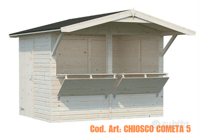 CHIOSCO PREASSEMBLATO IN LEGNO PER VENDITA - BIGLIETTERIA Due versioni proposte: chiosco assemblato a pannelli in pianta stabile (mod. COMETA) chiosco automontante, facilmente montabile in 15 minuti (mod. VELOX) I nostri chioschi in legno, disponibili in diverse dimensioni , sono graziose vetrine commerciali, realizzate in legno di abete nordico certificato che migliorano il tuo modo di vendere, con un prodotto conveniente ed elegante! Design versatile, funzionalità e facilità di montaggio rendono il chiosco prefabbricato un vero gioiello da utilizzare durante fiere ed eventi. Perfetti per aree relax, bar o cucina all’aperto, biglietteria o cassa, chiosco per eventi e feste, esposizione e vendita di prodotti. Il legno nordico di alta qualità, permette una longevità del chiosco in legno fuori dal comune. (MATERIALI TOP) CARATTERISTICHE: Spess. pareti: 16mm Spess. perlina tetto: 16mm Dimensioni Apertura frontale : 236x 82cm Dimensioni porta: 76 x 169 cm Impermeabilizzazione tetto: compresa Raccorderia e minuteria maniglie: compresa nello specifico: CHIOSCO COMETA 5 - EURO 1.520,00€ dim. 273x190 CM PAVIMENTO COMPRESO Altezza laterale: 189cm Altezza al colmo: 229cm Dim. Imballo: 320x100xH60 cm Peso: 425 kg CHIOSCO COMETA 8.2 - EURO 2.250,00€ Dim. 323x259 CM PAVIMENTO COMPRESO Altezza laterale: 189cm Altezza al colmo: 239cm Dim. Imballo: 400x100x80 cm Peso: 440 kg Chiosco in legno Mod. VELOX - EURO 2.230,00€ Dim. 298x228 CM PAVIMENTO COMPRESO Apertura: Lunga tutta la parete Altezza laterale: 207cm Altezza al colmo: 245cm Dim. imballo 320x120x70 cm Peso: 650 kg Prezzo valido per ritiro in magazzino con adeguato mezzo. Eventuale consegna Centro-Nord Italia a preventivo. CHI SIAMO: Mondo Gazebo il riferimento italiano per la progettazione, fornitura e posa in opera di qualsiasi struttura temporanea mobile. GAZEBO SERRA CASETTA LEGNO CAPANNONE TENDONE PER FESTE COPERTURA VEICOLI POMPEIANA VERANDA