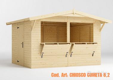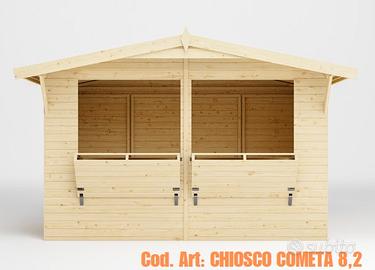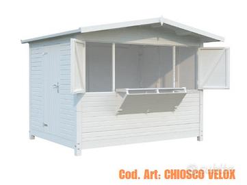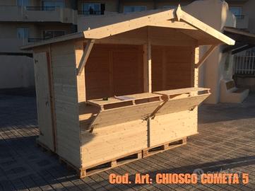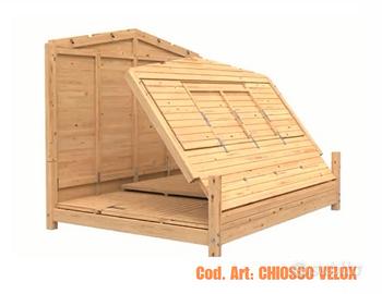 CHIOSCO PREASSEMBLATO IN LEGNO PER VENDITA - BIGLIETTERIA Due versioni proposte: chiosco assemblato a pannelli in pianta stabile (mod. COMETA) chiosco automontante, facilmente montabile in 15 minuti (mod. VELOX) I nostri chioschi in legno, disponibili in diverse dimensioni , sono graziose vetrine commerciali, realizzate in legno di abete nordico certificato che migliorano il tuo modo di vendere, con un prodotto conveniente ed elegante! Design versatile, funzionalità e facilità di montaggio rendono il chiosco prefabbricato un vero gioiello da utilizzare durante fiere ed eventi. Perfetti per aree relax, bar o cucina all'aperto, biglietteria o cassa, chiosco per eventi e feste, esposizione e vendita di prodotti. Il legno nordico di alta qualità, permette una longevità del chiosco in legno fuori dal comune. (MATERIALI TOP) CARATTERISTICHE: Spess. pareti: 16mm Spess. perlina tetto: 16mm Dimensioni Apertura frontale : 236x 82cm Dimensioni porta: 76 x 169 cm Impermeabilizzazione tetto: compresa Raccorderia e minuteria maniglie: compresa nello specifico: CHIOSCO COMETA 5 - EURO 1.520,00€ dim. 273x190 CM PAVIMENTO COMPRESO Altezza laterale: 189cm Altezza al colmo: 229cm Dim. Imballo: 320x100xH60 cm Peso: 425 kg CHIOSCO COMETA 8.2 - EURO 2.250,00€ Dim. 323x259 CM PAVIMENTO COMPRESO Altezza laterale: 189cm Altezza al colmo: 239cm Dim. Imballo: 400x100x80 cm Peso: 440 kg Chiosco in legno Mod. VELOX - EURO 2.230,00€ Dim. 298x228 CM PAVIMENTO COMPRESO Apertura: Lunga tutta la parete Altezza laterale: 207cm Altezza al colmo: 245cm Dim. imballo 320x120x70 cm Peso: 650 kg Prezzo valido per ritiro in magazzino con adeguato mezzo. Eventuale consegna Centro-Nord Italia a preventivo. CHI SIAMO: Mondo Gazebo il riferimento italiano per la progettazione, fornitura e posa in opera di qualsiasi struttura temporanea mobile. GAZEBO SERRA CASETTA LEGNO CAPANNONE TENDONE PER FESTE COPERTURA VEICOLI POMPEIANA VERANDA