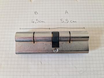 Vendo per inutilizzo cilindro europeo nichelato Securemme Evo K1, completo di 5 chiavi e tessera per duplicazione. In perfette condizioni in quanto usato un anno soltanto. Misura totale 10cm, A 5,5cm e B 4,5cm.