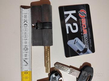 Cilindro europeo Securemme K2 misure 30/30, con predisposizione per pomolo interno. Il cilindro è dotato di 5 chiavi, una delle quali manca però della parte dell'impugnatura in plastica. Col cilindro viene fornita la scheda con il codice necessario per la duplicazione delle chiavi. Il tutto è perfettamente funzionante, dismesso per sostituzione portoncino blindato.