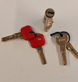 Cilindro ISEO Serie F5, a profilo europeo, in ottone nichelato, con meccanismo di cifratura verticale a 5 spine, con 4 chiavi tradizionali a denti in dotazione, lunghezza 85 mm, praticamente quasi nuovo, vendo per installazione serratura smart