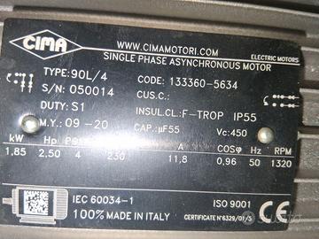 Prodotto MADE IN ITALY marca Cima 4 poli 1320 rpm ottima qualita' prodotto italiano 100% grandezza 90L con piedini, scatola derivazione in alluminio. Ottimo per betoniera, molazza ecc 220v monofase alta coppia. Albero 24mm. Disponibilita altri motori e riduttori nuovi e usati, inverter vettoriali nuovi e usati, monofase trifase, salvamotori, magnetotermici ecc.