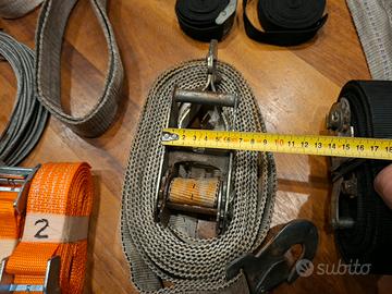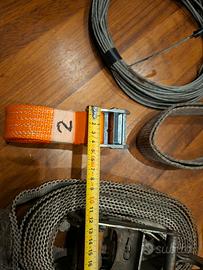 Cinghie a cricchetto, cavo acciao e guanti in pelle nuovi. I cricchetti sono circa 6 mt di lunghezza ed il cavo d'acciaio è 30 mt. Guanti in pelle nuovi tagli xxl (11).