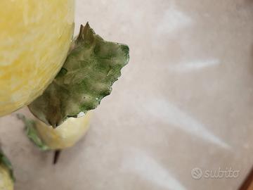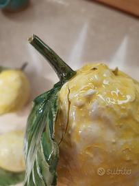 Cinque limoni in ceramica artigianale, realizzati a mano dai fratelli Mennella di Ischia. Tutti i limoni sono delle stesse dimensioni, eccetto uno più grande. Lunghezza del limone più grande (con gambo): circa 14-15 cm. Lunghezza degli altri quattro: circa 12-13 cm. Altezza del più grande, posizionato orizzontalmente: circa 7 cm. Uno dei limoni ha una piccola sbeccatura sul retro di una foglia, ma non visibile frontalmente. Il limone più grande, come da foto, presenta una crepa. In generale, presentano piccole irregolarità superficiali tipiche della lavorazione a mano, che non sono difetti ma parte integrante del processo artistico. Solo il limone più grande presenta la firma sul retro della foglia. I fratelli Mennella di Ischia sono rinomati per la produzione di ceramiche artistiche, che includono anche sculture in ceramica come frutti e animali. Questi oggetti sono creati artigianalmente e ogni pezzo è unico. La bottega è una delle più antiche dell'isola, con una tradizione di oltre 500 anni.