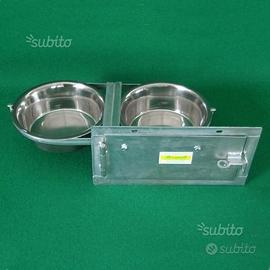 Ciotola girevole doppia per cani con sistema antiribaltamento. Lo sportello si avvita alla rete del recinto e permette l'utilizzo senza dover entrare. Le ciotole sono in acciaio inox e possono essere estratte per la pulizia. Adatta per crocchette, mangime o acqua.