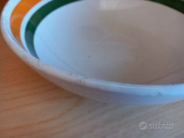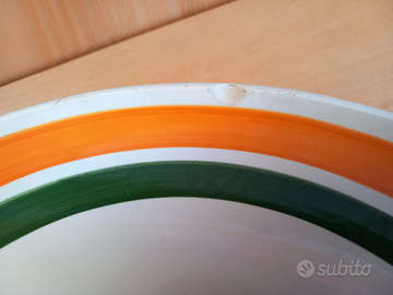 Ciotola grande, in ceramica, bianca, con 2 cerchi colorati verde/arancio; molto vecchia e con molti segni d'uso e del tempo: screpolature, scheggiature, abrasioni > bella proprio x queste sue caratteristiche. La classifico come "ottimo stato" perché chi la apprezzerà saprà farne il giusto uso. Suggerisco una sistemazione come complemento di arredo da giardini. Marchio sul retro: ITALIA CERAMICA, stoviglierie dipinte a mano. Dimensione diametro all'orlo 30 cm; altezza 11 cm