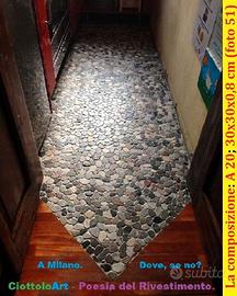 Ciottoli di fiume misti, naturali, tagliat nello spessore di 8 mmi, su rete in fibra di vetro.