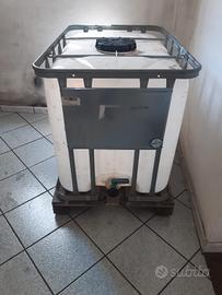 Cisterna in plastica con gabbia in ferro con rubinetto,messa su bancale . Capienza 600 litri.