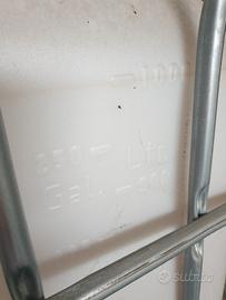 Cisterna per recupero acqua piovana da 1000L con gabbia tubolare in acciaio zincato. Poggia su un pallet in legno. Dotata di rubinetto. Mai utilizzata. In deposito, al chiuso, in un capannone. Ritiro in loco, non spedisco