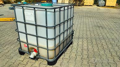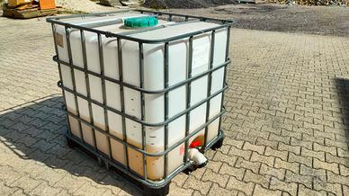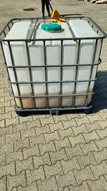 Cisterna, recipiente da 1000 litri di materiale in plastica dura con struttura in materiale metallico.