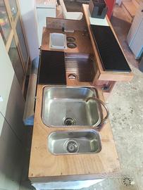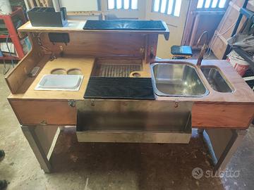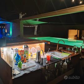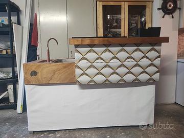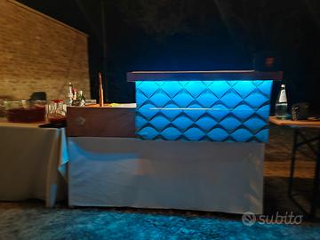 vendo postazione da cocktail termica, basta inserire all' interno delle bottiglie ghiacciate e ti rinfresca sia la frutta che le bottiglie. Costruito in solido multistrato marino da 18 mm e resinato, smontabile nell' alzatina e nelle gambe, luci led con Power bank o con presa diretta, lavandino con sistema di acqua in pressione per fare scorrere l'acqua in continua... molto elegante e funzionale, usato in diversi matrimoni. completa di tasca per le bottiglie. misure 180 x 70 cm circa