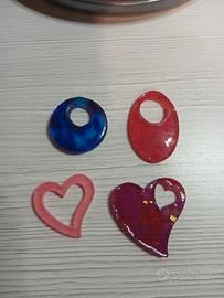 Regalo kit Colourplast: 10 colori di granulare di plastica che si può fondere per creare ciondoli (come da esempio in foto) o decorazioni. Le scatole sono quasi tutte piene circa la metà. Aggiungo tre vassoietti in metallo da utilizzare come supporto in fase di fusione nel forno e filo flessibile in ottone per preparare il contorno della formina. Si possono utilizzare anche gli stampi per biscotti in metallo.