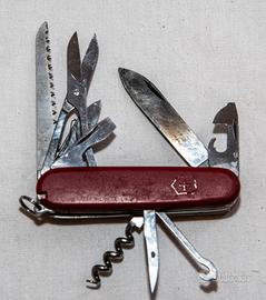 Coltello tascabile 14 funzioni, made in Switzerland: lama grande; lama piccola; apriscatole; cacciavite 3/6 mm; apri bottiglia; spelafili; punteruolo; cavatappi; forbici; sega per legno; gancio multiuso; stuzzicadenti; portachiavi.