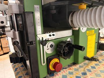 Macchina combinata per legno a 6 lavorazioni composta da Sega circolare Ø 200 mm, Carrello a squadrare con una corsa massima di 500 mm , Fresatrice/Toupie, Pialla filo/spessore da 154 mm di larghezza con 2 coltelli, Cavatrice, alimentata da un motore monofase da 1.100 W