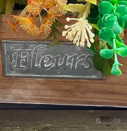 Composizione decorativo per centro tavola realizzata con spugna da fioraio in cestino di legno leggero con scritta in metàllo come da foto.