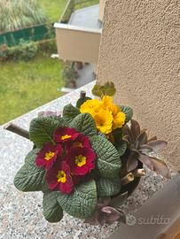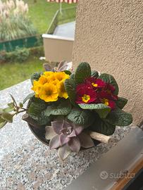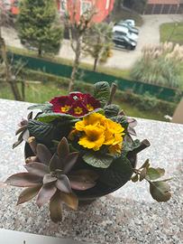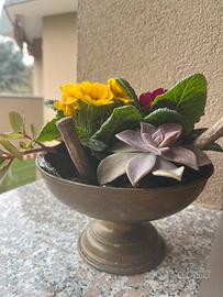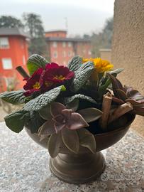 Vendo una composizione di primule e piante grasse nel vaso di ottone