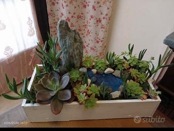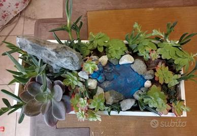 Vendo composizione artigianale eseguita su base in marmo e sperone di roccia, con piante grasse di diverse specie, la composizione raffigura anche un piccolo laghetto in resina epossidica al centro .