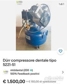 Vendo ottimo e di qualita’ compressore odontoiatrico a secco (senza olio lunrificante) da 28 litri…. Bicilindrico.Un po’ datato del 1979 … ma come si dice…. Gallina vecchia…. Distributore e regolatore pressione nuovi con attacchi rapidi…. Silenziosissimo,infatti io lo uso in appartamento senza dare fastidio…. La ruggine e’ solo superficiale perché stava in balcone all’ aperto anche se al coperto…. Usati li vendono sui 1500 euro…. Nuovi quasi 4000 … non sono quelli dei centri commerciali…. Ha qualche perdita aria da controllare ma nulla che non sia una ordinaria manutenzione… io lo utilizzo cosi’ per miei lavoretti… non adatto per verniciare servirebbe da 100 litri…