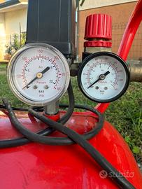 • Controllo: Equipaggiato con pressostato (la scatola nera che accende e spegne il motore automaticamente) e due manometri (uno per la pressione del serbatoio e uno per la pressione di lavoro regolabile).