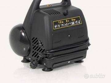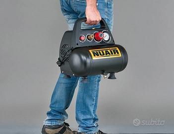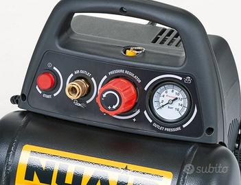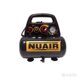Compressore ad aria Nuair. Motore da 1,5 Hp. Serbatoio 6 litri. Gruppo pompante in alluminio pressofuso privo di lubrificazione. Con ganci. Piedi a ventosa per stabilità.