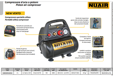 Nuair New Vento è un compressore ad aria con motore da 1,5 HP e serbatoio da 6 litri. Fa parte della categoria "compressori coassiali oilless", dotato di gruppo pompante realizzato in alluminio pressofuso caratterizzato dall'assenza di lubrificazione, con motore a bassa velocità estremamente silenzioso, perfetto per i lavori in casa e il bricolage. Pratico da utilizzare grazie al completo pannello di controllo; comodo grazie alla presenza di ganci: uno per gli accessori e due per arrotolare il cavo elettrico. E' dotato di piedini a ventosa che assicurano un'ottima stabilità ed è facile da trasportare e da riporre.