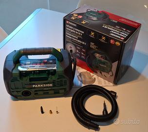 Vendo compressore Parkside ricaricabile da 20Vnuovo. Gonfia oltre 10 atmosfere,display bar/psi/kpa.comodissimo,lo attacchi allo pneumatico...ti dice la sua pressione e impostando la pressione desiderata gonfia la gomma e raggiunta la pressione si ferma da solo,spettacolo.inoltre puoi gonfiare (e sgonfiare)anche in spiaggia gonfiabili e palloni