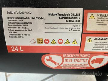Vinco KWU750-24L - Compressore aria elettrico silenziato 24 lt oilless Ottimo per chi abita in condominio e non vuole evitare i rumori- - motore 1.0 hp Serbatoio compressore 24 l, Pressione massima 8 bar, Aria aspirata 180 l/min, Giri al minuto testata 1440 RPM, Lubrificazione oil-less / a secco, Tipo pompa monostadio, Potenza nominale 1 HP, Azionamento monofase 230V, Fissaggio gruppo pompante Saldat Comprato nel 2024 e usato solo per piccoli lavori di bricolage, come nuovo, vendo per passaggio a modello piu capiente
