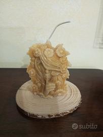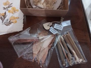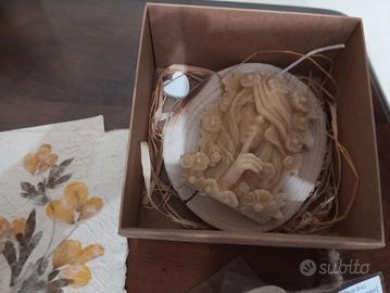 Confezione contenente candela in pura cera d'api e.. bastoncini di finocchio selvatico, foglie di alloro, cannella essiccati da utilizzare come incensi naturali. La candela ha anche una base in legno. La confezione contiene anche una lettera con busta realizzata artigianalmente in Madagascar in corteccia di albero e petali di fiori