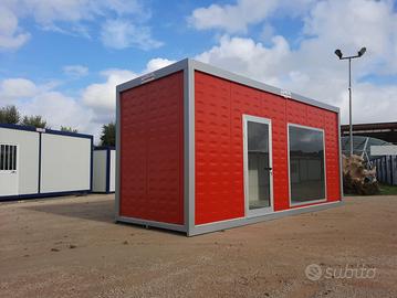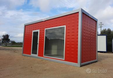 Container box prefabbricato uso ufficio personalizzato con infissi in alluminio silver e pannelli rossi effetto rugby.