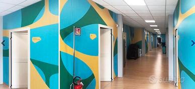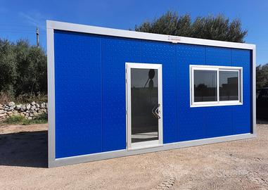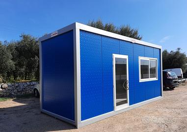 Container box prefabbricato uso ufficio nuovo, personalizzato con infissi in alluminio silver e pannelli colorati blù effetto bubble . Dimensioni 6,08 x 2,40 metri.