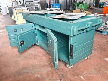 contenitore isotermico carrellato usato, si tratta di un carrello di marca Cambro in plastica spessa per il trasporto e mantenimento passivo della temperatura di pasti pronti in vasche GN 1/1, con ripiano e 4 vani per la dispensa degli alimenti nella parte superiore, e 3 vani inferiori laterali nella parte inferiore. utile in ristorazione collettiva come mense, self service e sagre.