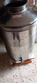 Contenitore olio 100 litri acciaio inox con rubinetto e piedistallo in legno.