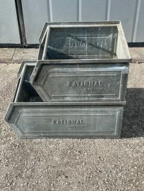 Contenitori in ferro zingati a bocca di lupo e impilabili (disponibili più pezzi e di diverse dimensioni) Dimensione per contenitori grandi: lunghezza - 72cm larghezza - 47cm altezza - 31cm