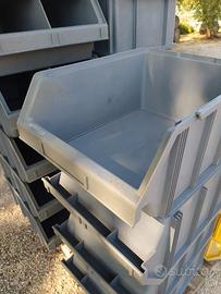 Contenitori a bocca di lupo in plastica, multicomponibili ed autoportanti a bocca di lupo in grado di creare delle pareti di magazzino senza alcuna necessità di sostegni, ripiani o scaffali. Sono sovrapponibili, agganciabili lateralmente, completi di porta-etichetta frontale.