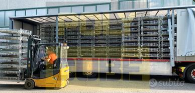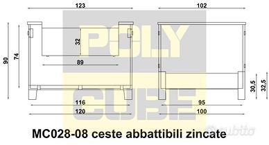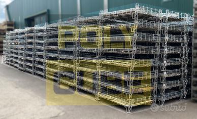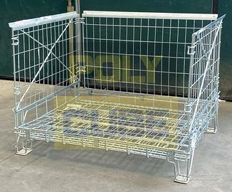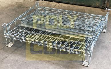 Ceste o gabbie in filo metallico zincato. Sono impilabili tra loro così da formare un sistema di scaffalatura modulare. Hanno l’apertura a ribalta sul lato lungo ed è possibile l’accatastamento anche con bancali standard 120x100 con eventuali relativi contenitori paretali grazie al profilo superiore in lamiera a L. Quando non sono usate si possono ripiegare così da abbattere i costi di trasporto, i costi della logistica di ritorno e lo spazio magazzino.