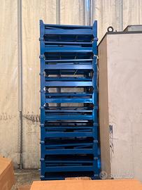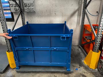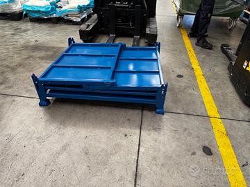 Disponiamo di circa 30 contenitori in ferro ripiegabili e impilabili, misure: Base 115cm altezza 90cm profondità 100cm peso 76kg, portata 1000kg Altezza da chiuse 33cm I contenitori sono disponibili sempre al costo di 60 euro l’uno