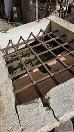Contorno finestra in pietra con inferriata. Misure interne 92 x 80 cm.
