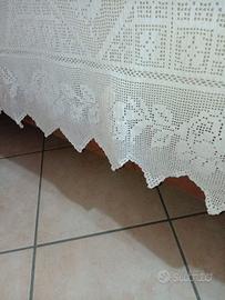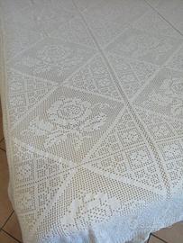 Questa coperta matrimoniale, realizzata a mano all'uncinetto, è un'opera di artigianato fine ed elegante. È realizzata in cotone bianco di alta qualità (cotone BBB8 numero 8) e presenta una lavorazione a filet perso che conferisce alla superficie una delicata texture. Le sue dimensioni sono generose: 270 cm di larghezza e 260 cm di lunghezza, con una bordura di 21 cm che arricchisce e rifinisce il bordo.