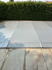 Copertura 4 mt x 9mt con barre di sicurezza in alluminio, telo gommato colore grigio, con ganci da tassellare al pavimento e cricchetti per tensionamento, incluso srotolatore arrotolatore manuale. Ritiro a mano in quanto le dimensioni non permettono spedizione, eventualmente nei dintorni possibile consegna con camion, prezzo da concordare.